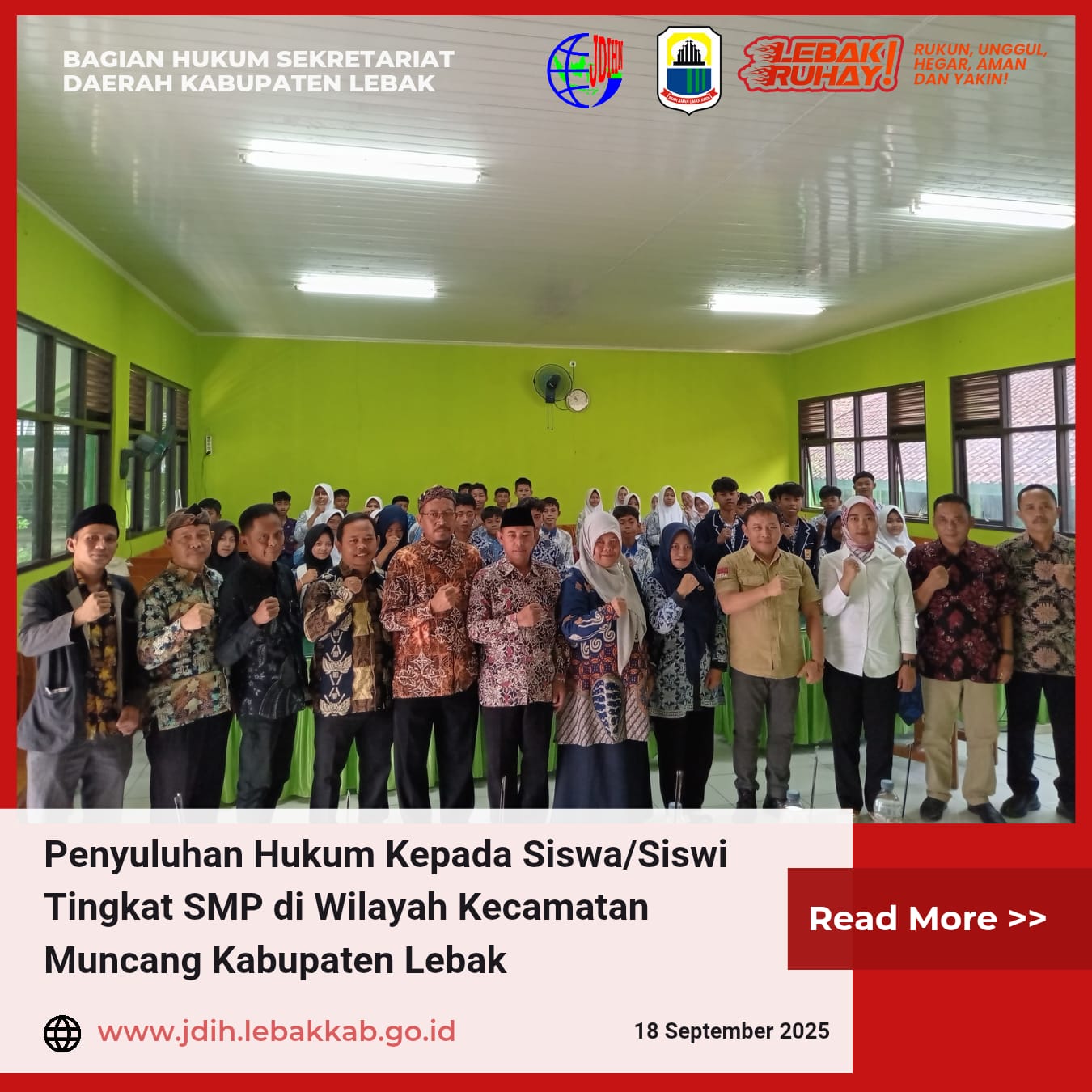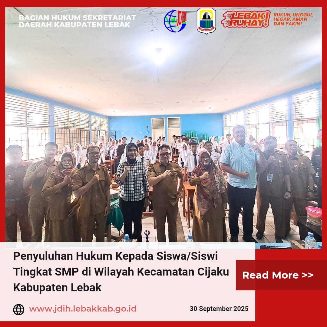 Lebak,- Bagian Hukum Sekretariat Daerah Kabupaten Lebak melaksanakan Penyuluhan Hukum Kepada Siswa/Siswi Tingkat Sekolah Menengah Pertama (SMP) di wilayah Kecamatan Cijaku Kabupaten Lebak, selasa (30/09/2025).